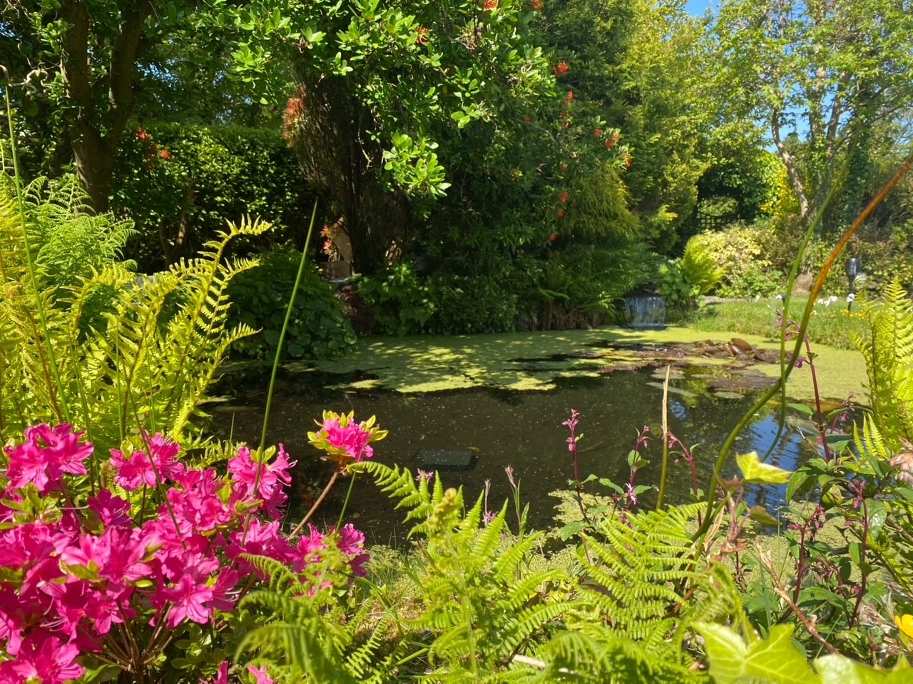 A lovely dining area enjoying picturesque views over the manicured gardens and tranquil pond.