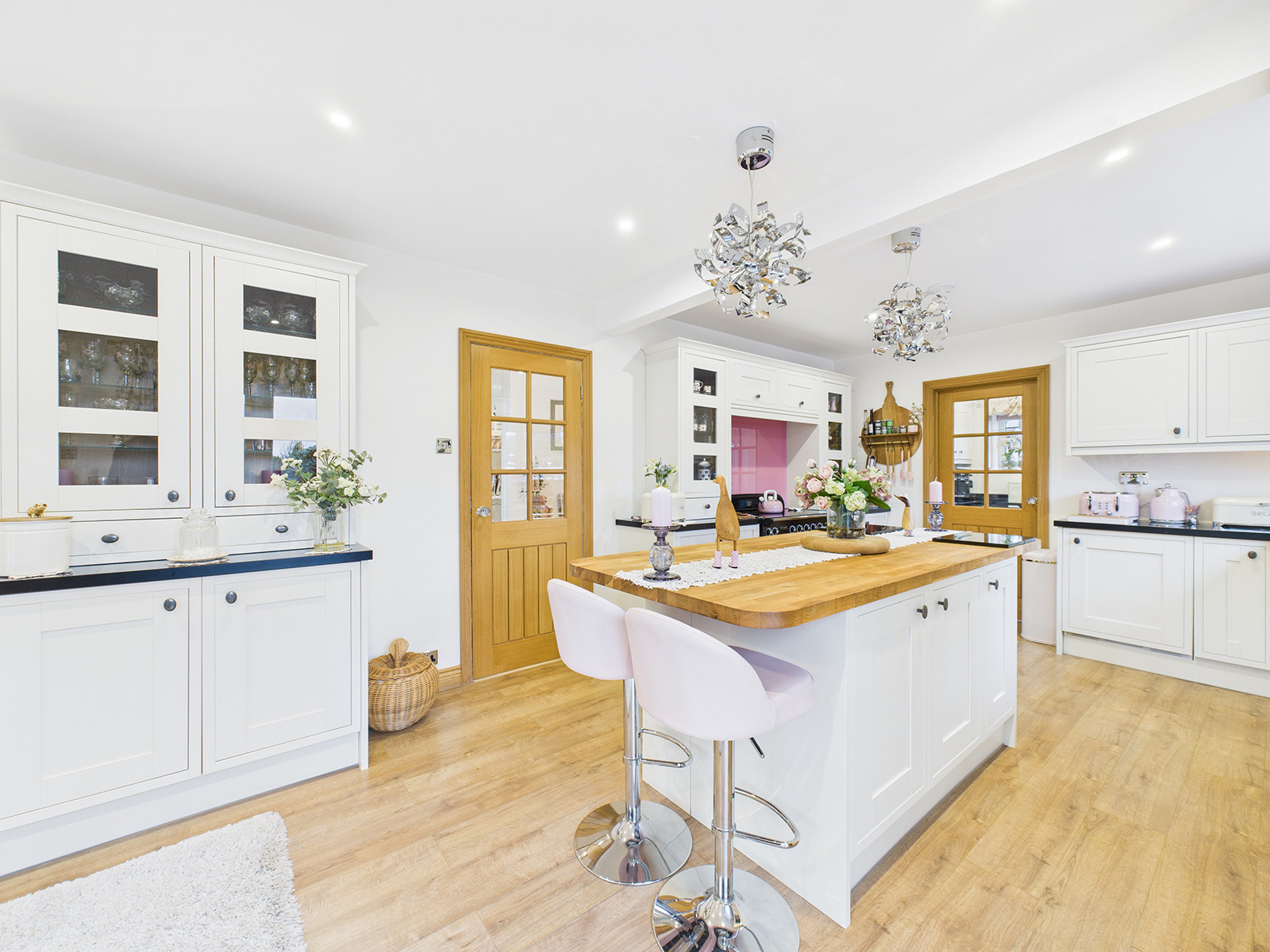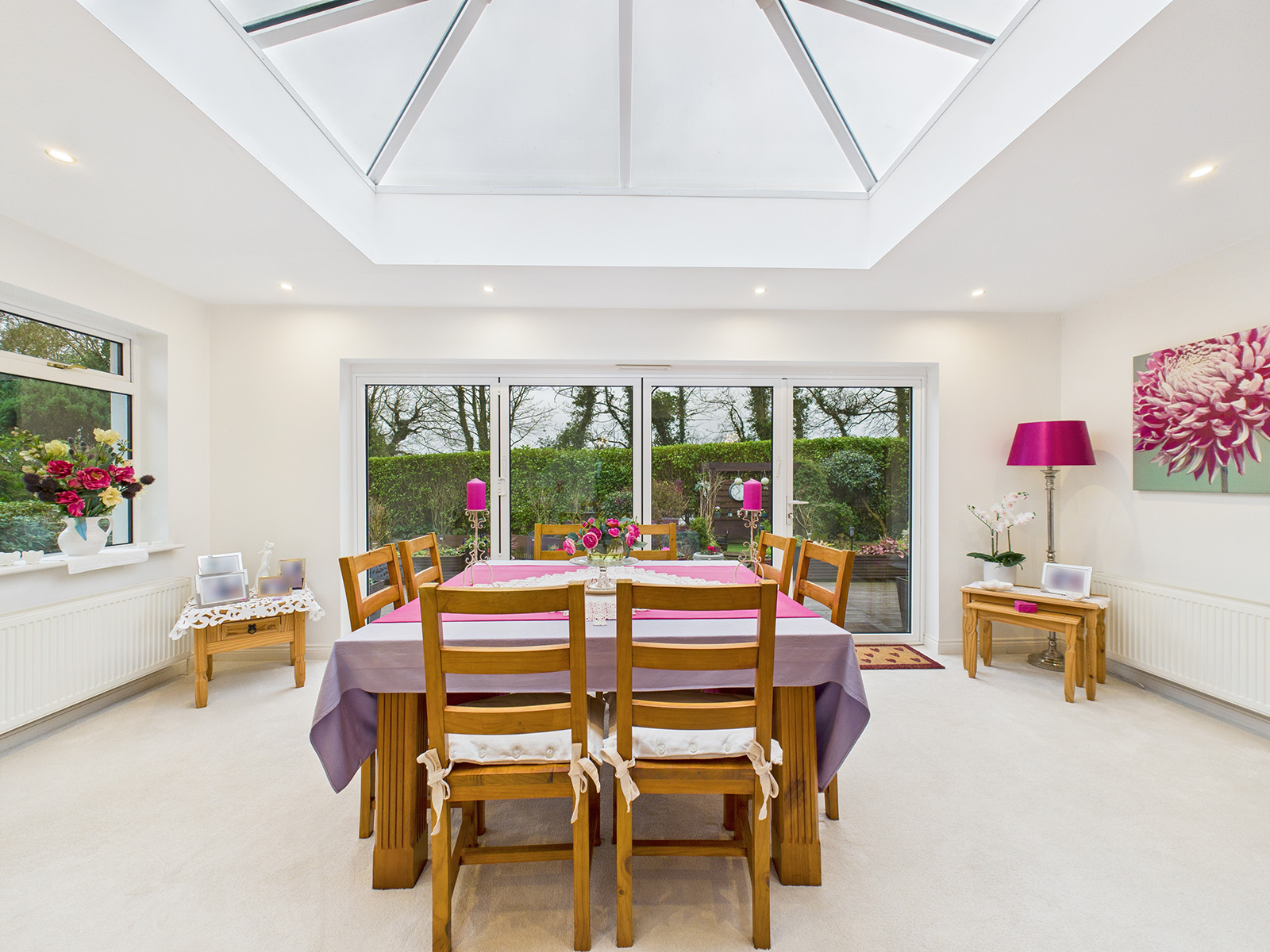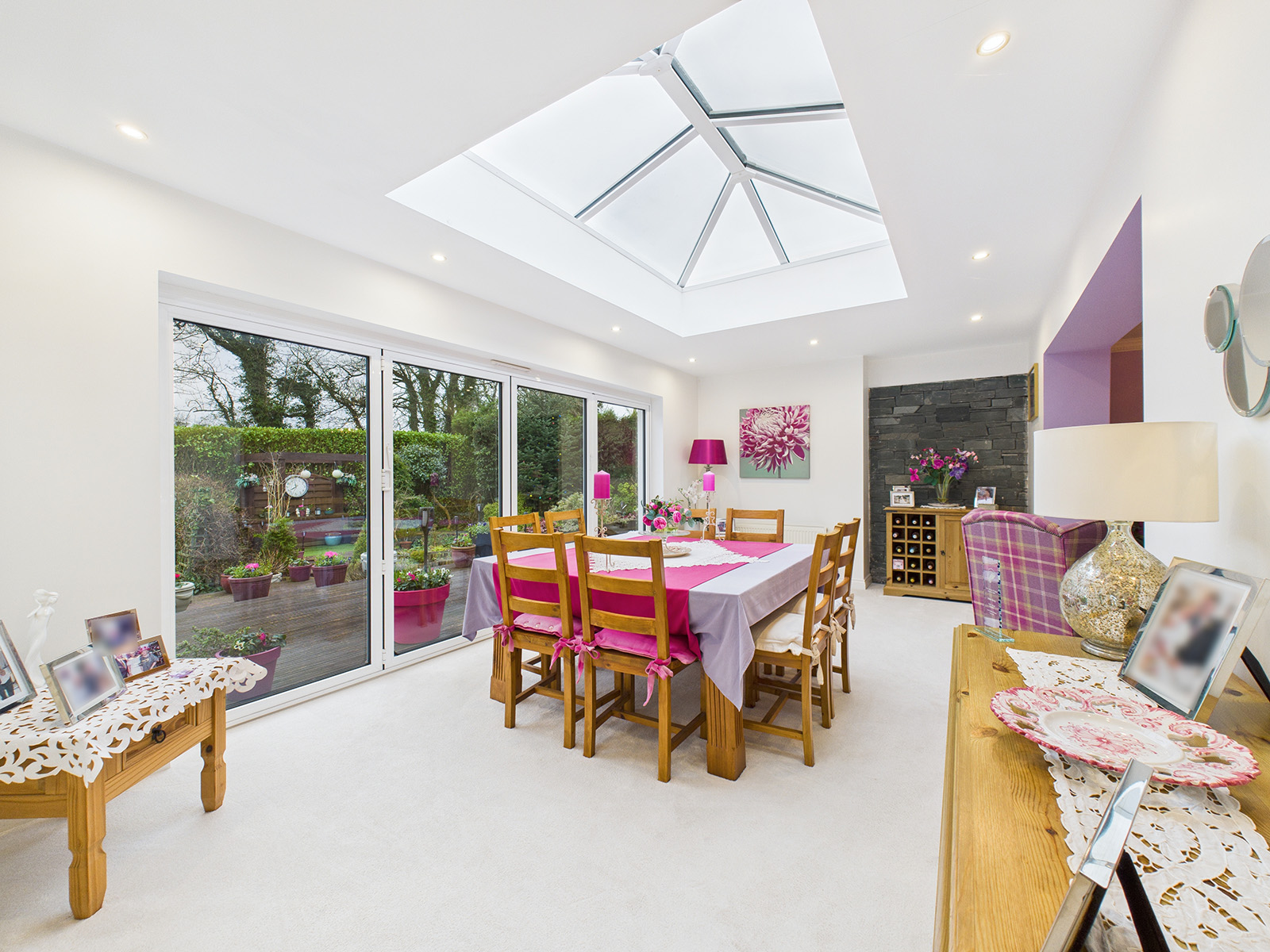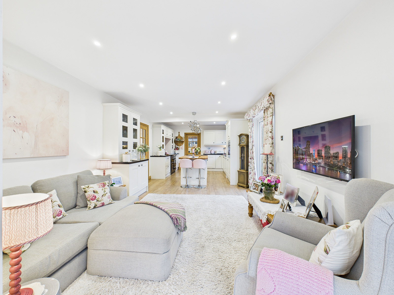 Recessed downlights provide a modern finish, and there is ample space for a large dining table and chairs.