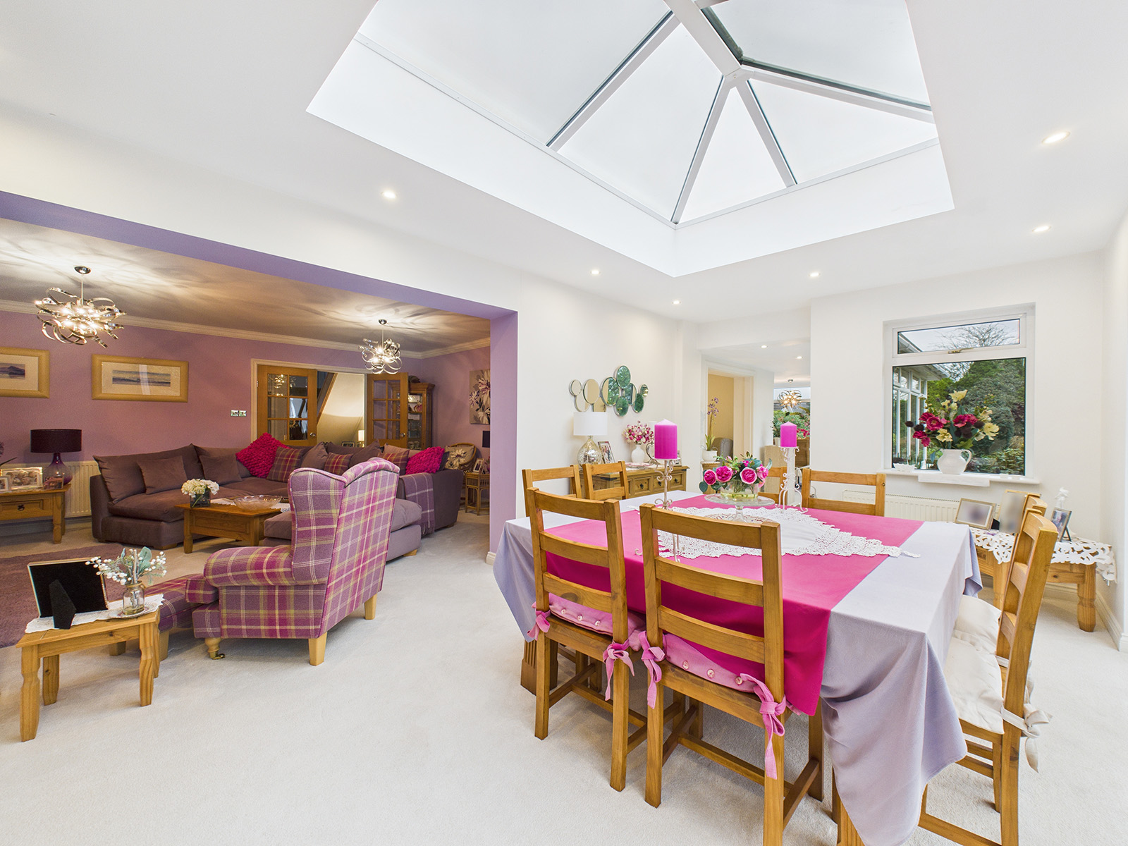 This light and airy space features a large roof lantern overhead, flooding the room with natural light.
