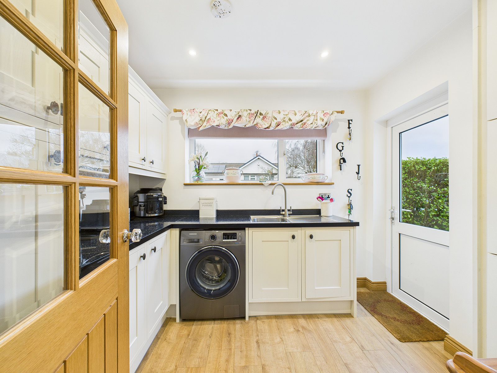 Shaker style units continue into the utility room, complemented by contrasting worktops incorporating a stainless steel sink and drainer.