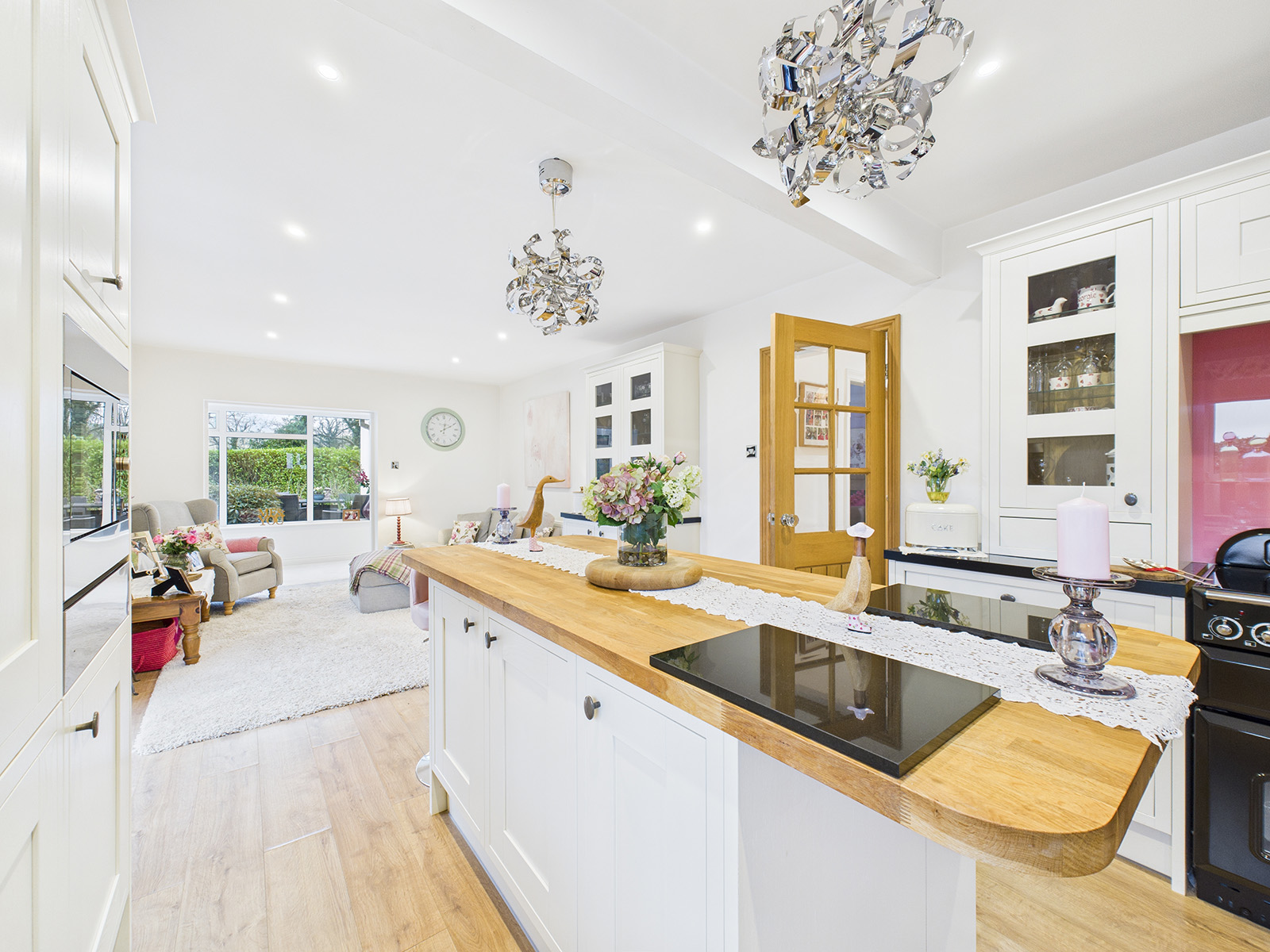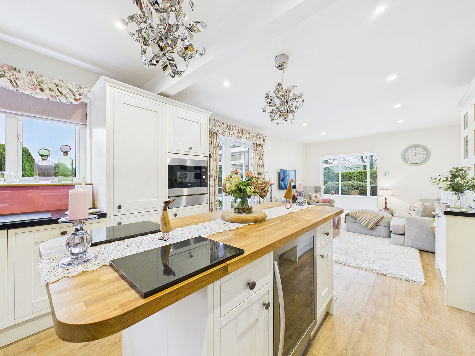 A Shaker‑style, fully fitted kitchen finished with contrasting stone‑effect worktops and a 1½ bowl sink. The Rangemaster cooking range includes twin double ovens, a grill, a warming drawer, and a 5‑ring induction hob. Additional features include an integrated microwave with warming drawer below, a full‑height integrated fridge, an under‑counter freezer, space for a wine cooler, and an integrated dishwasher. A central island provides further storage and worksurface space. A window overlooks the garden, while double doors open onto a large decked area, a perfect spot for enjoying a morning coffee.