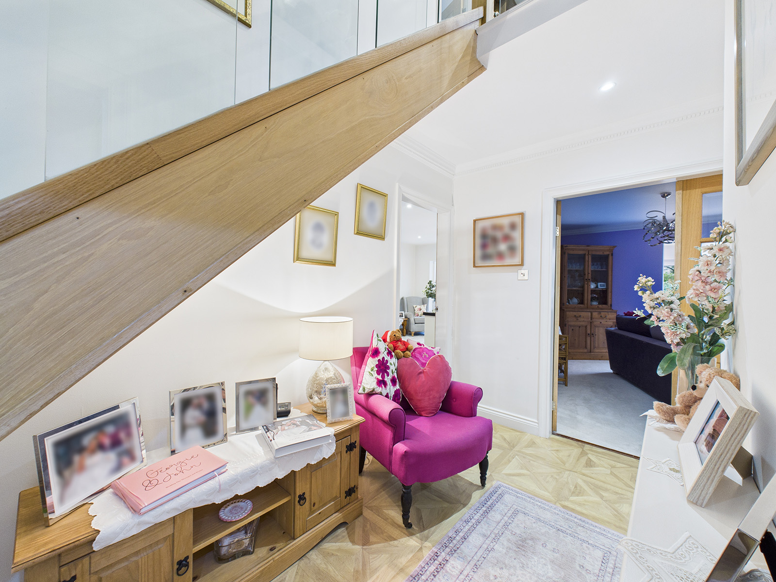 A modern oak staircase with contemporary glass balustrades rises to the first floor, leading to a gallery style landing. Wood flooring extends throughout the area.