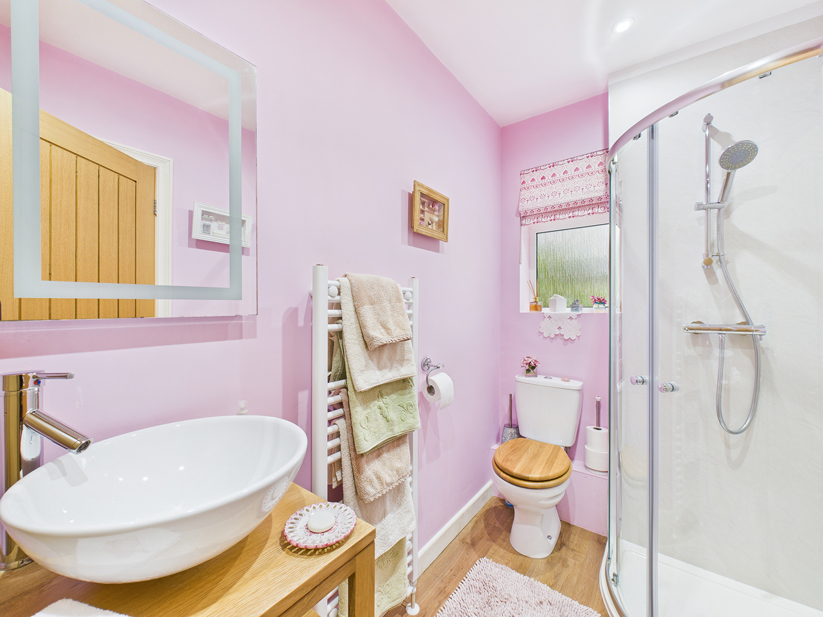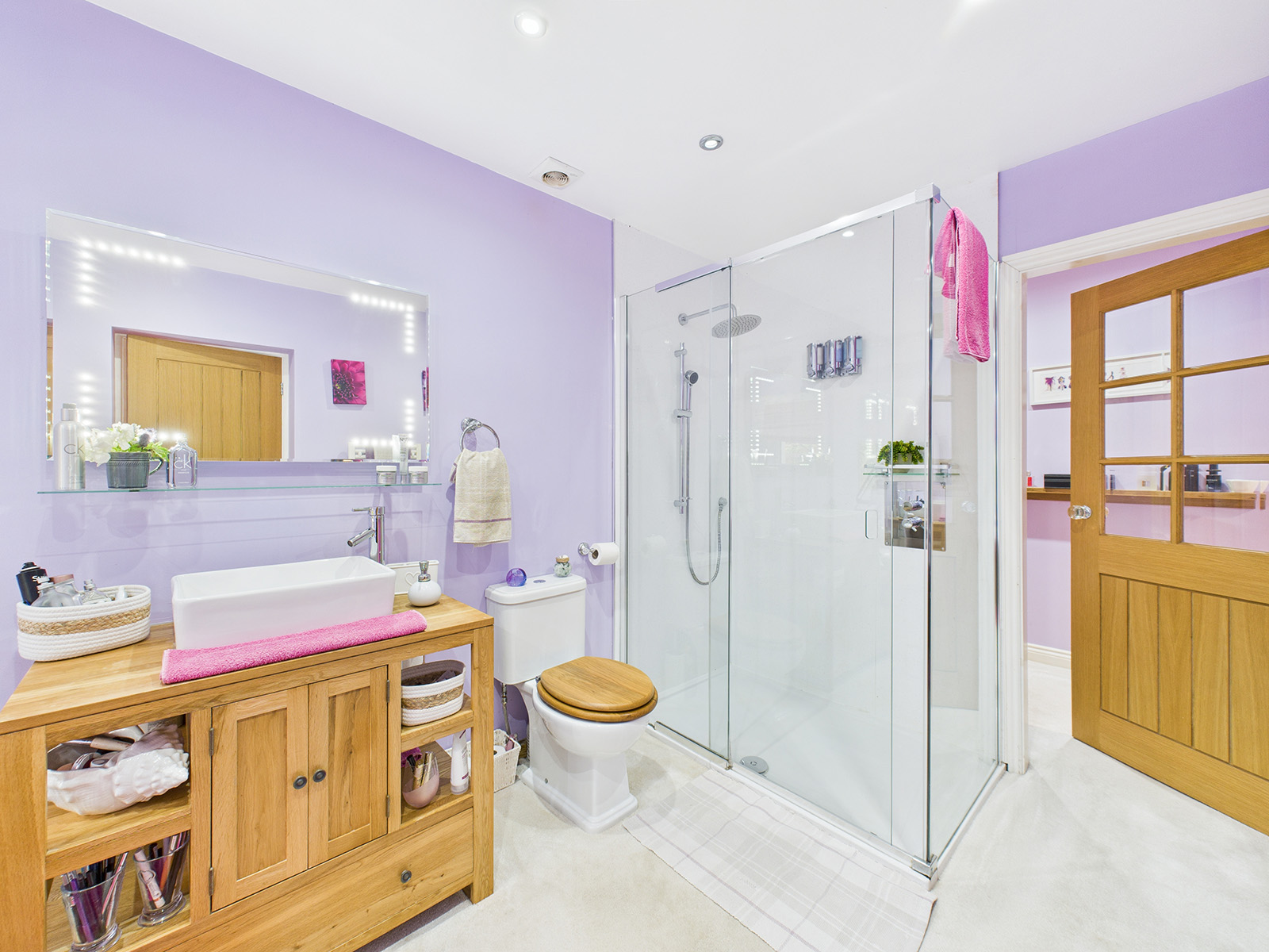 Additional features include his‑and‑hers heated towel rails, recessed modern lighting, and an extractor fan.