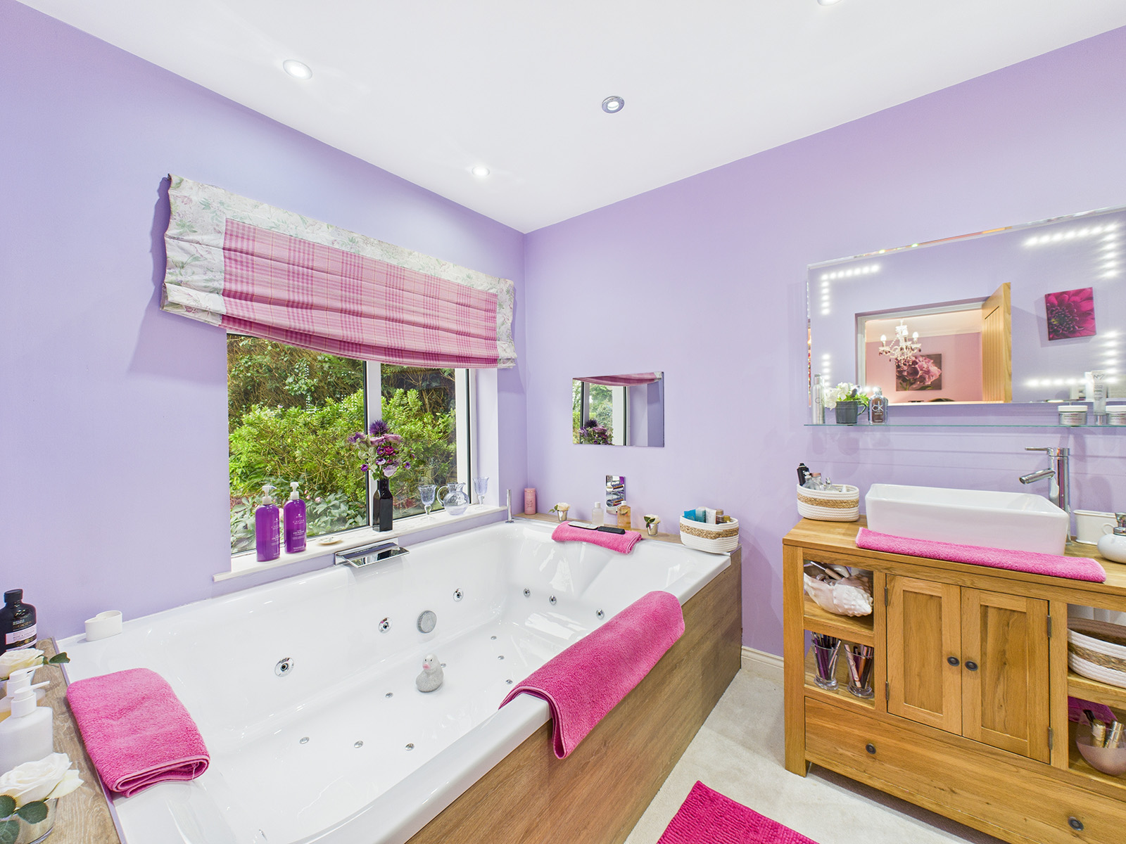 This includes a duo Jacuzzi bath with massage jets and a waterfall tap, perfectly positioned to enjoy views over the garden, along with a waterproof, wall‑mounted TV for added relaxation and entertainment.