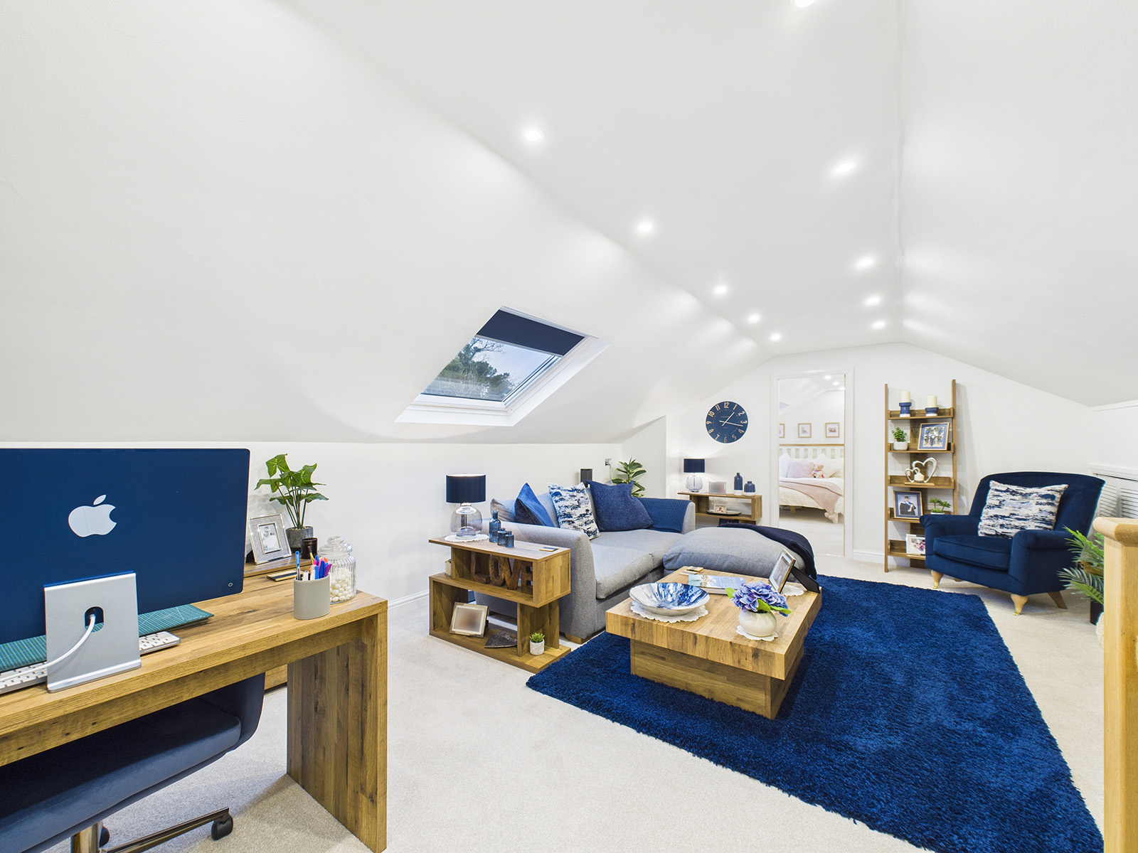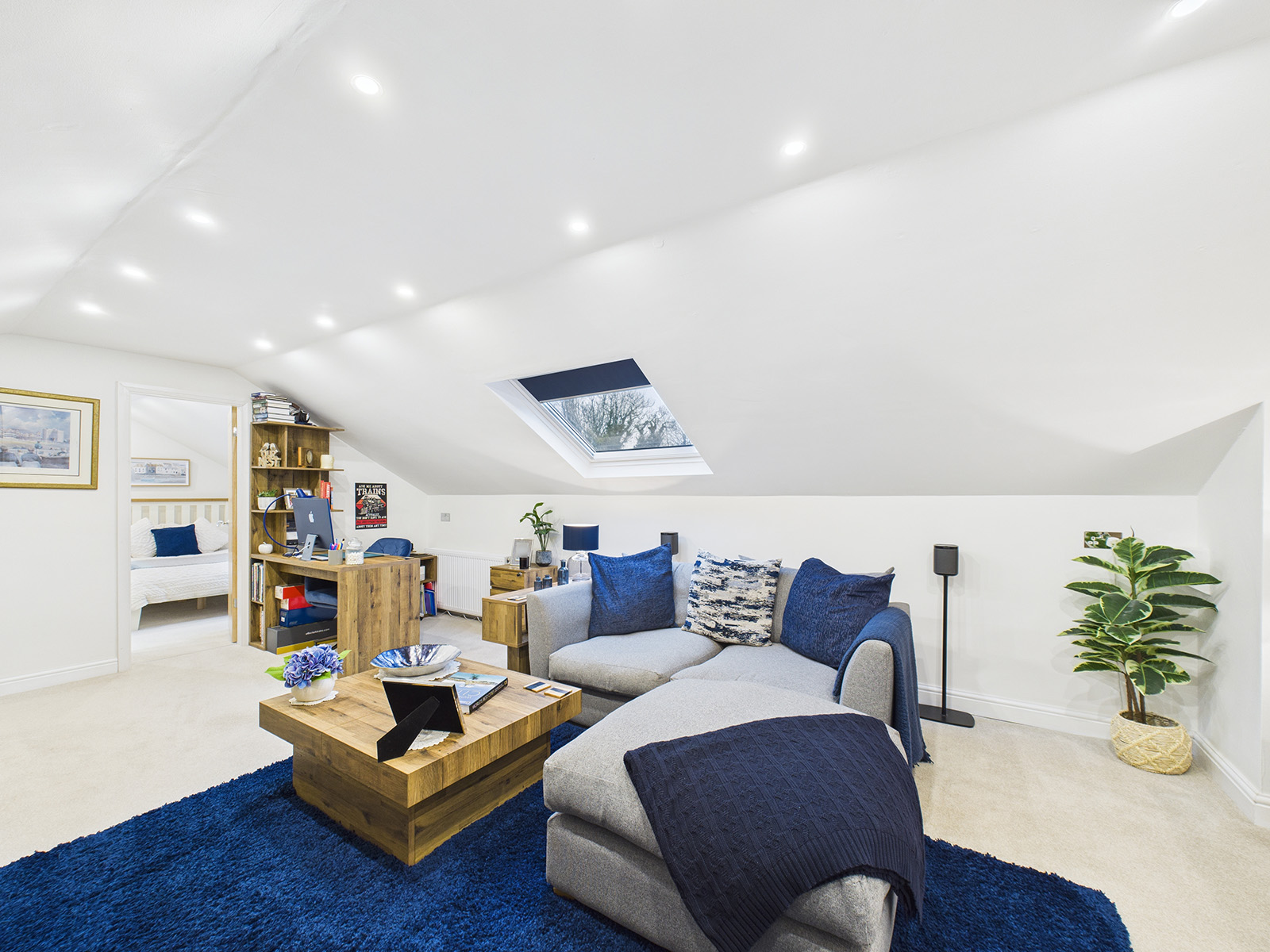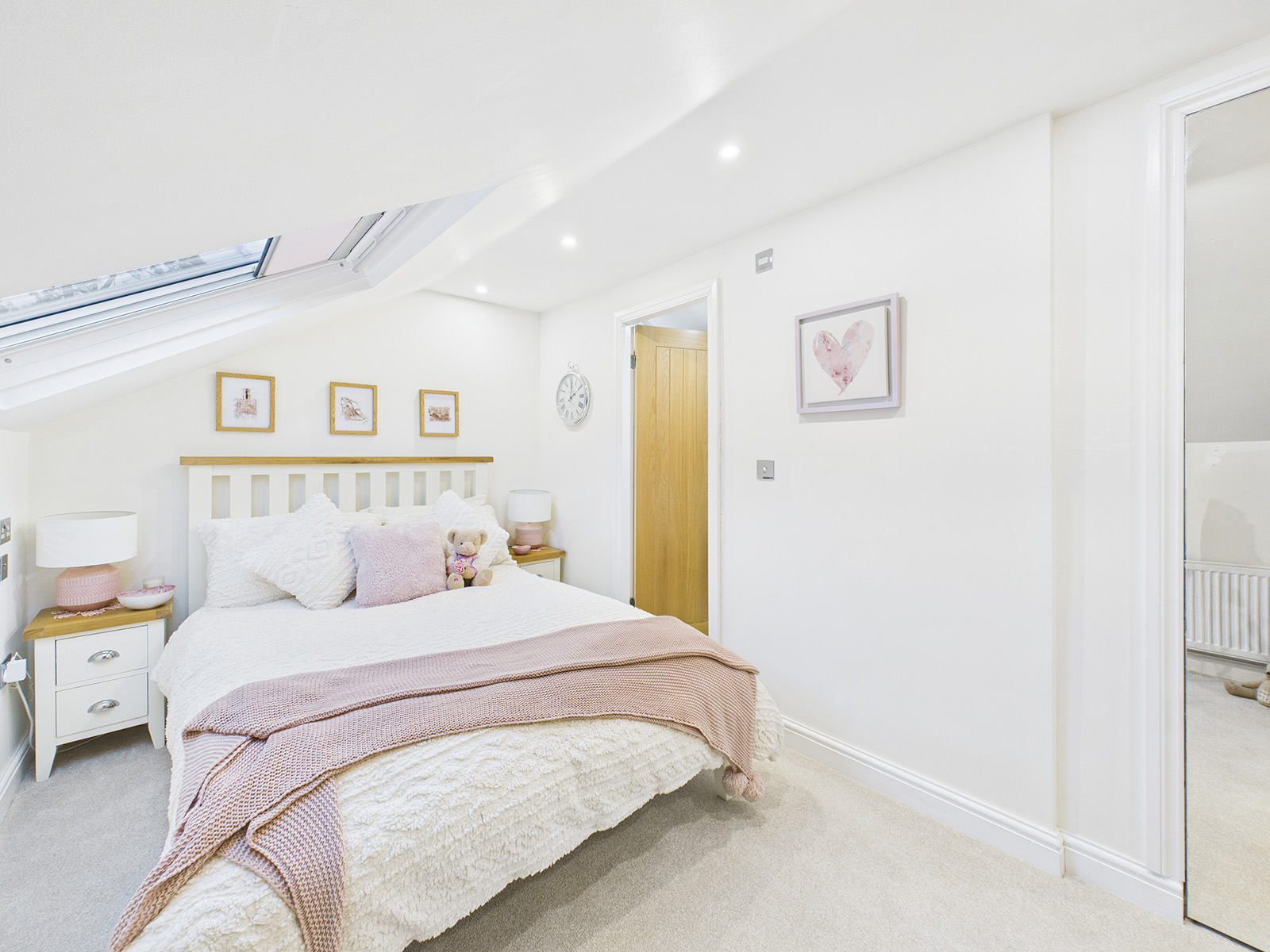 A light and airy double bedroom, enhanced by a large Velux window that fills the space with natural daylight. The room features recessed lighting for a clean, modern finish, and offers convenient access to eaves storage.