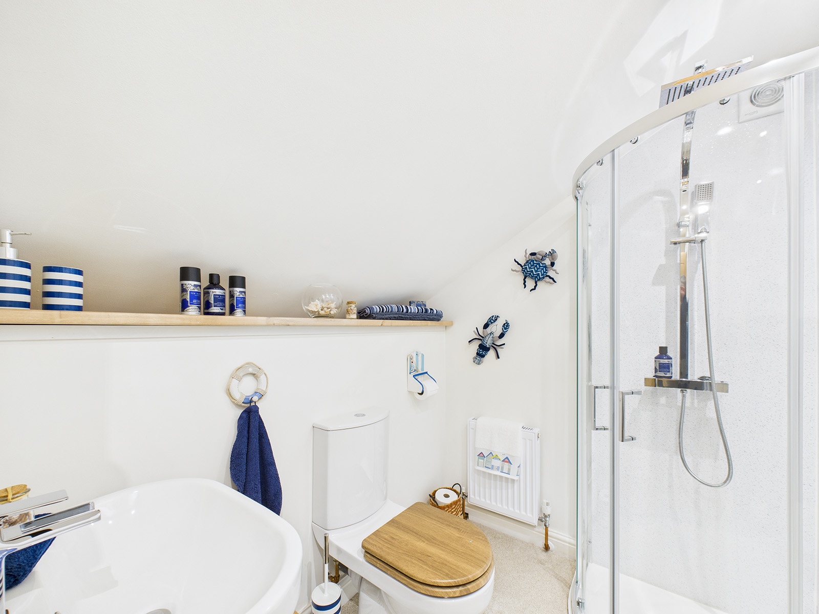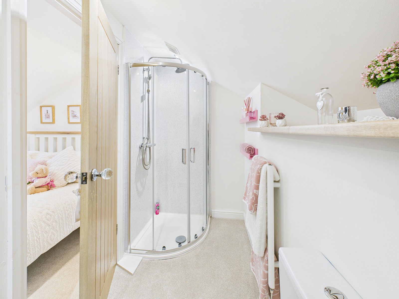 Corner shower cubicle fitted with easy to maintain dolphin board, glass screen, and sliding doors. The suite includes a WC and a wash hand basin with a shelving unit below for convenient storage. Additional features include a heated towel rail, recessed lighting, and further shelving providing ample additional storage.