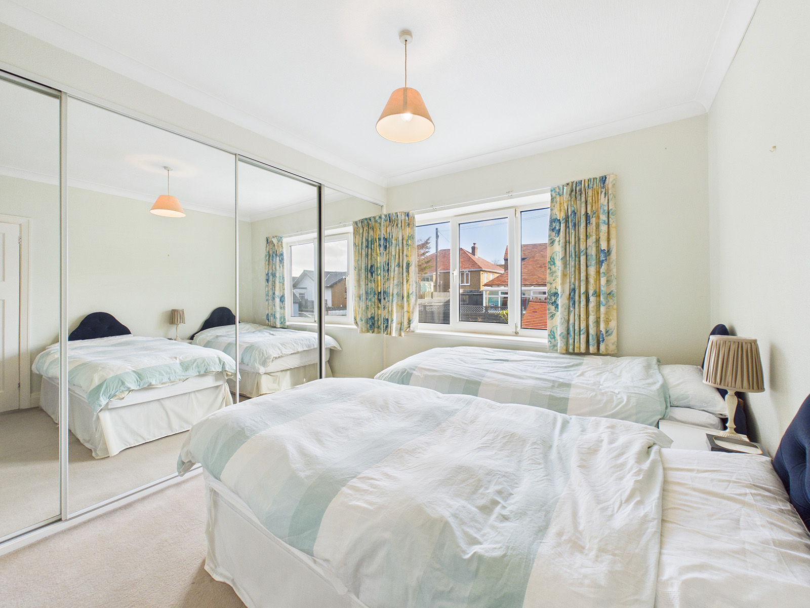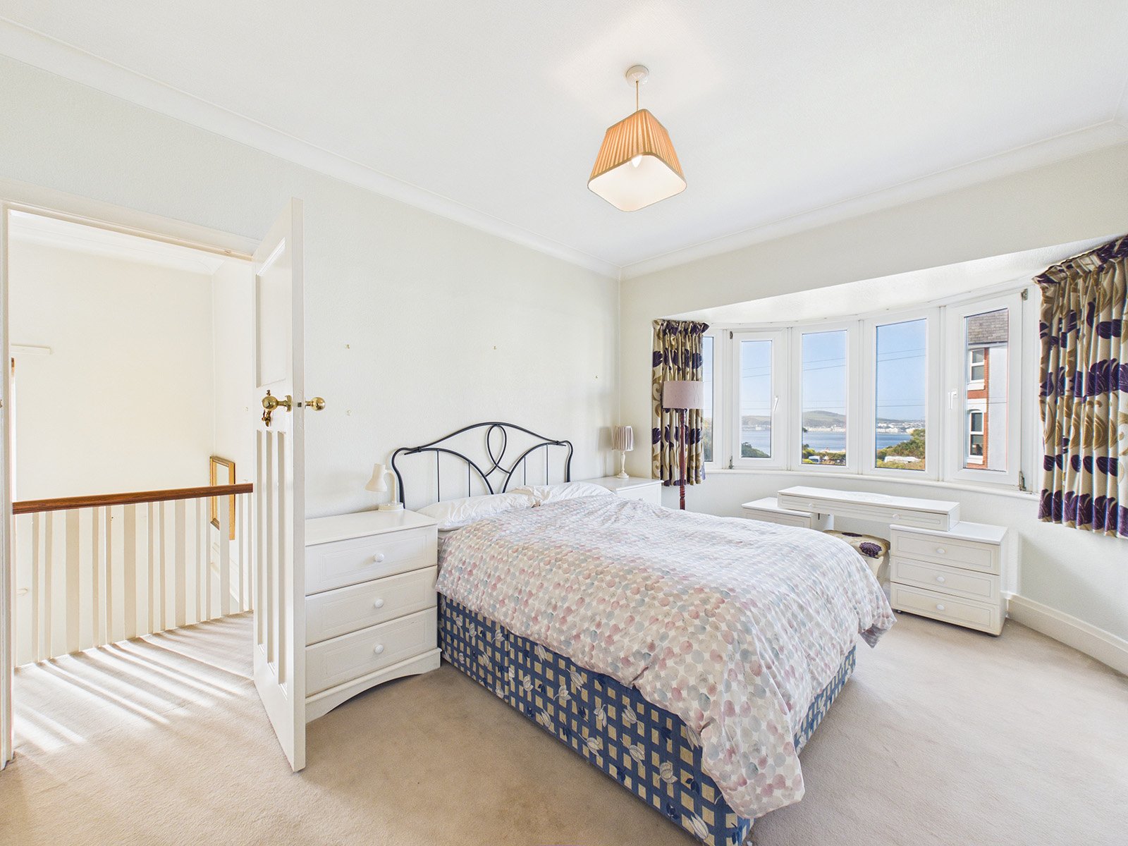 A spacious bedroom featuring a period bay window with lovely south‑westerly views towards Douglas Bay. The room includes wall‑to‑wall wardrobes with sliding doors.