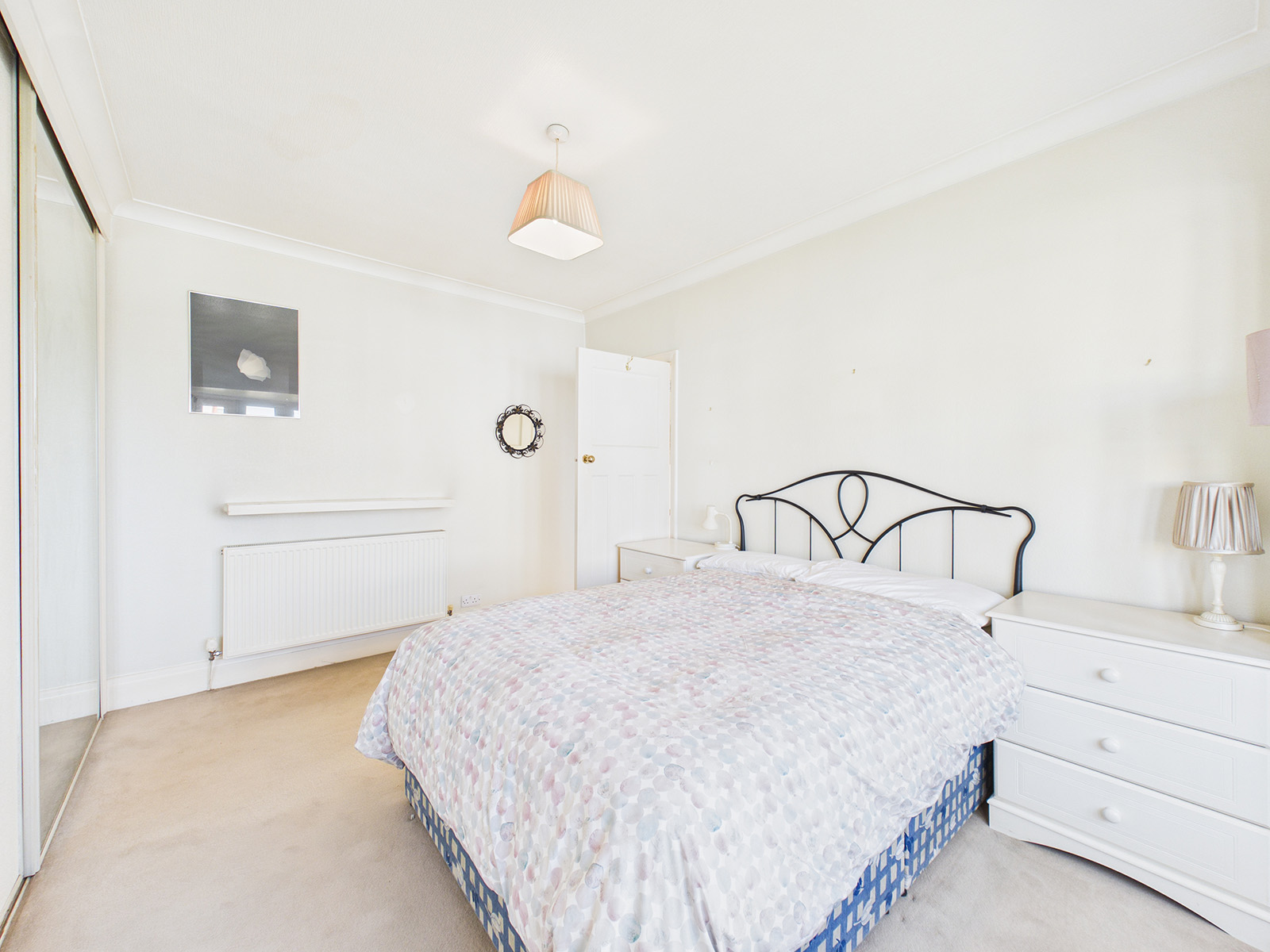 A double bedroom with a rear aspect, featuring wall‑to‑wall wardrobes with hanging, shelving and sliding doors.