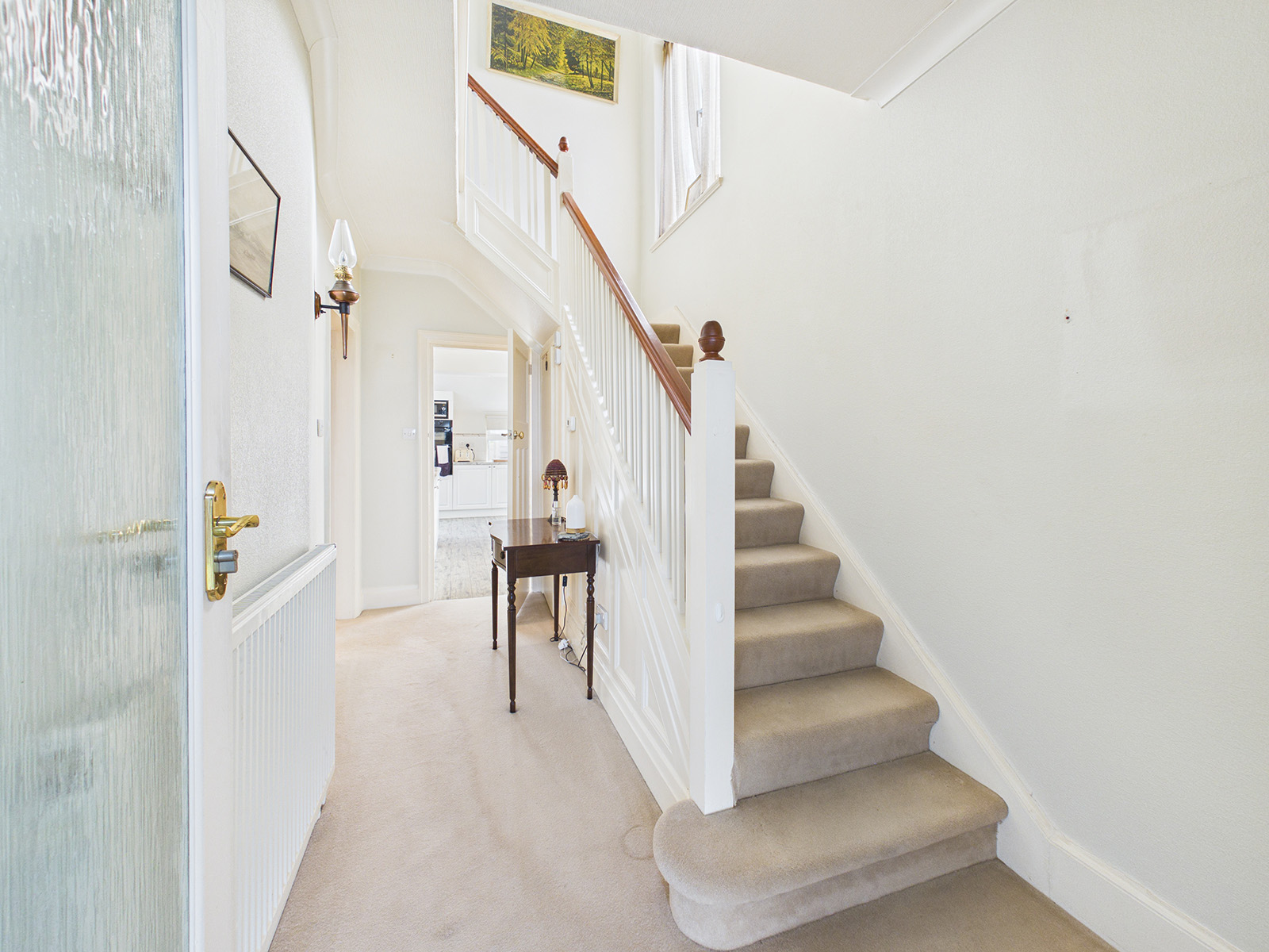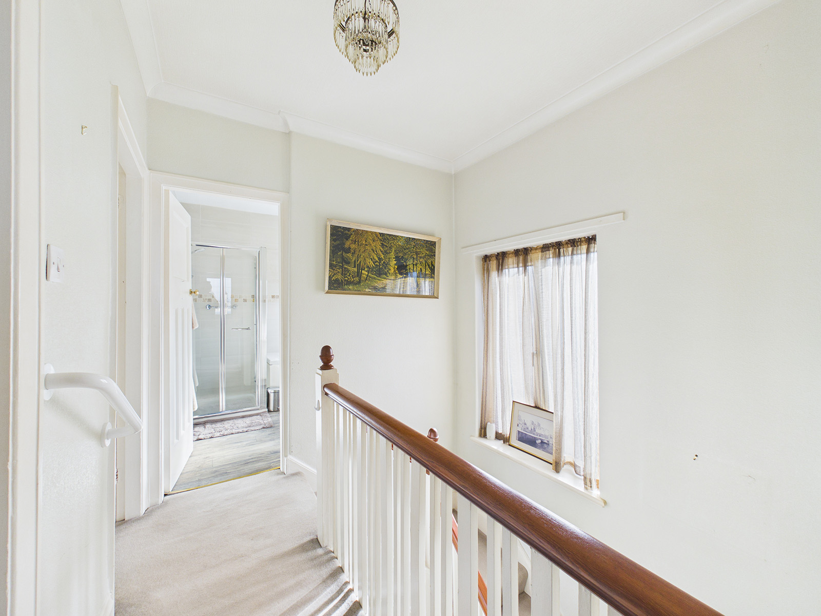 A light and airy landing with a large uPVC window and the original banister and balustrades.