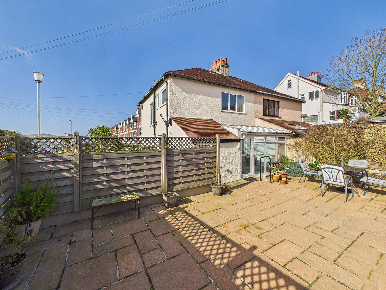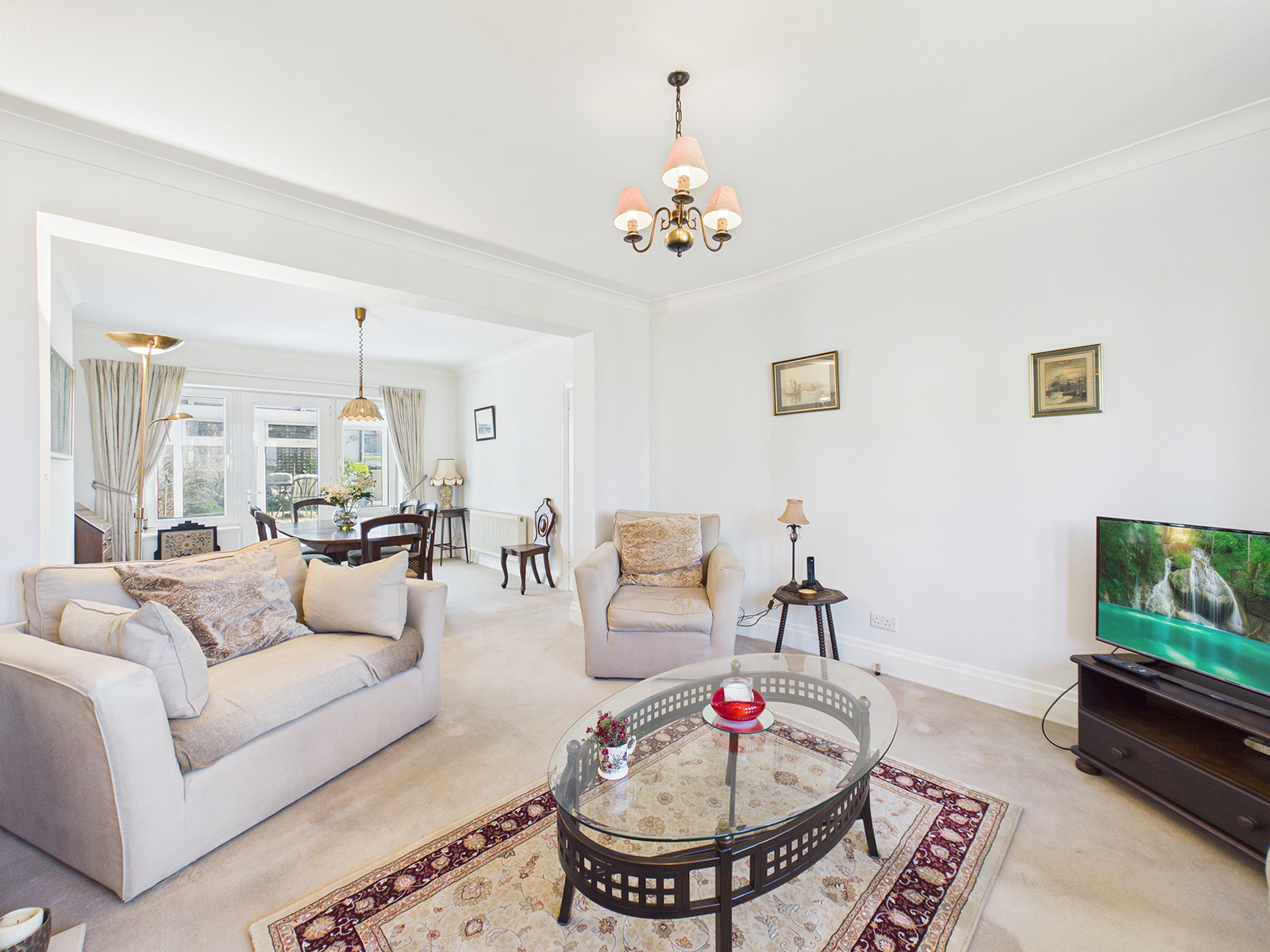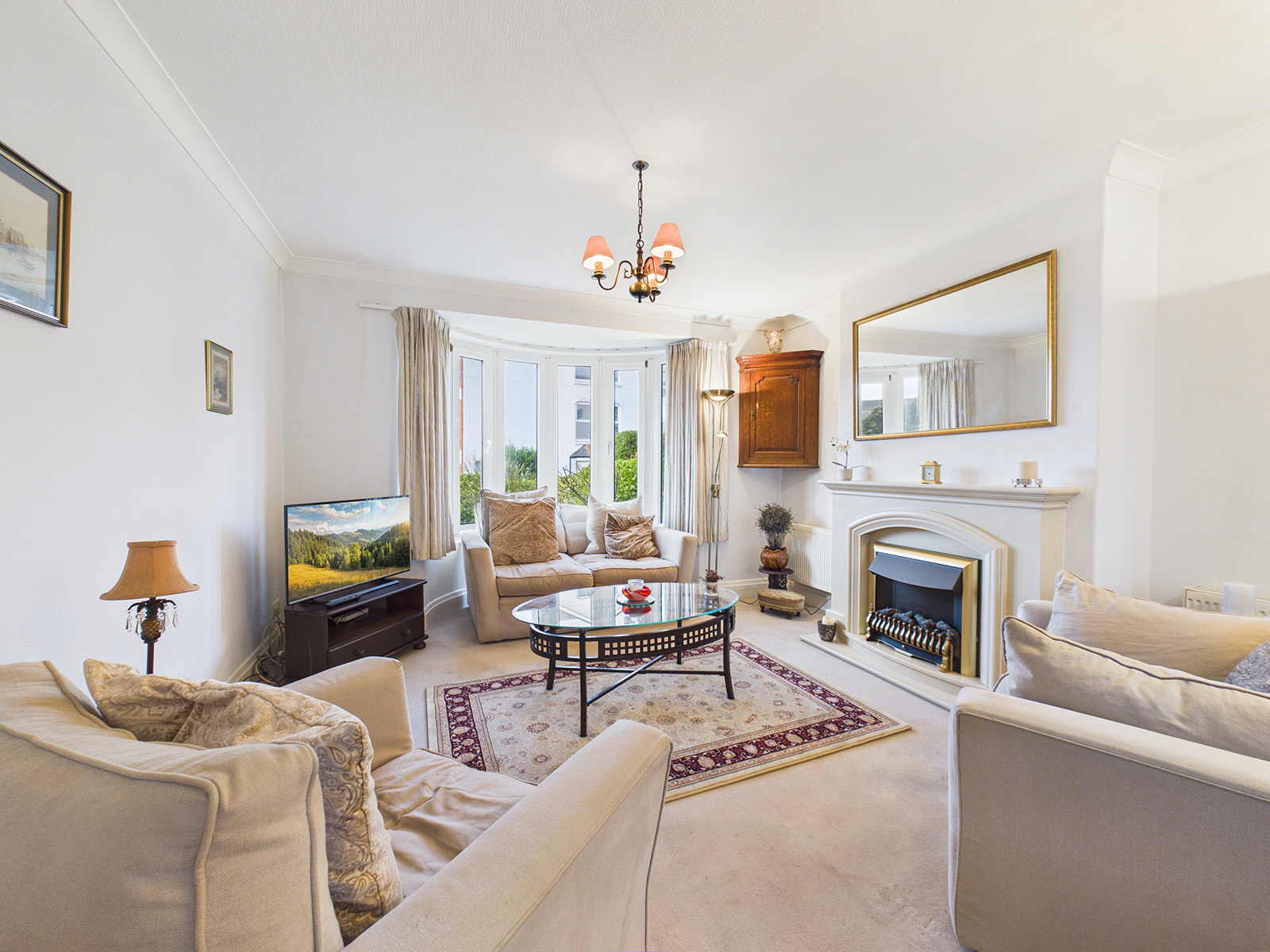 The lounge features a period bay window with south-west facing views over the garden towards Douglas Bay. There is a feature electric fire with a stone‑effect surround and hearth, and a television point.