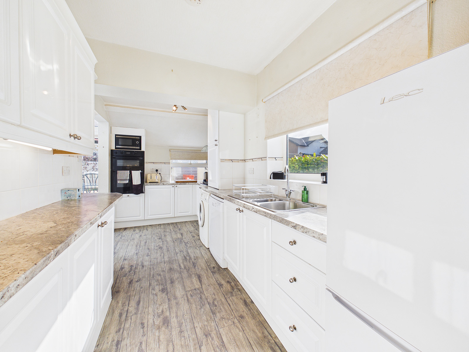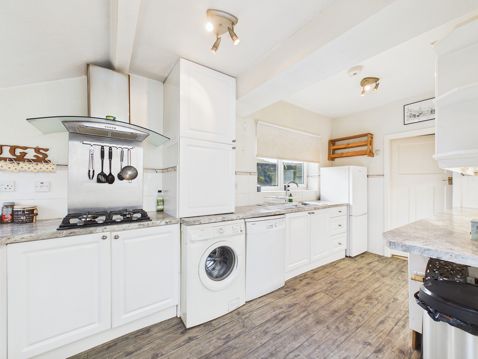 A fitted kitchen featuring a range of white fronted cupboards and drawers, complemented by a marble‑effect worktop which incorporates a 1½ bowl stainless steel sink and drainer, with tiled splashbacks. This well‑equipped kitchen includes a 4‑ring gas hob with a stainless steel splashback and extractor hood above, along with an eye‑level oven and grill. There is space and plumbing for an under‑counter dishwasher and washing machine, as well as a designated area for a tall fridge freezer. A cupboard discreetly houses the gas-fired central heating boiler.