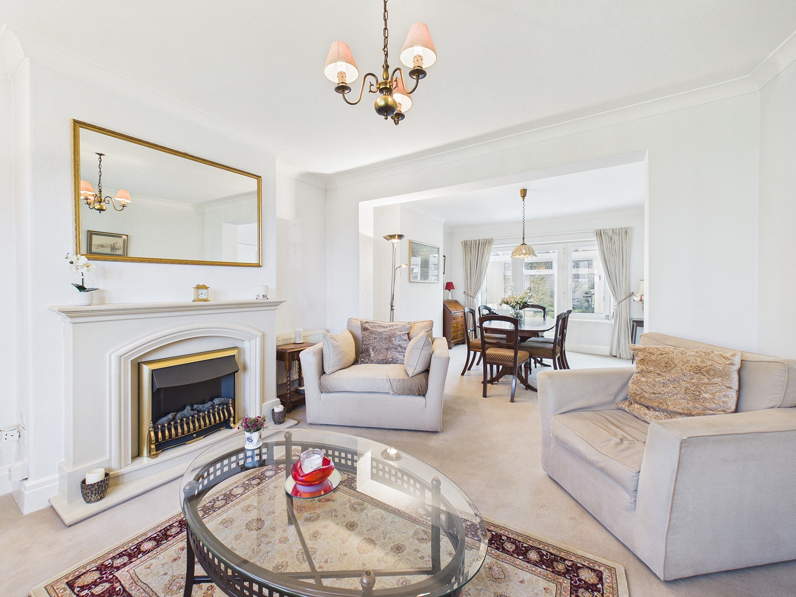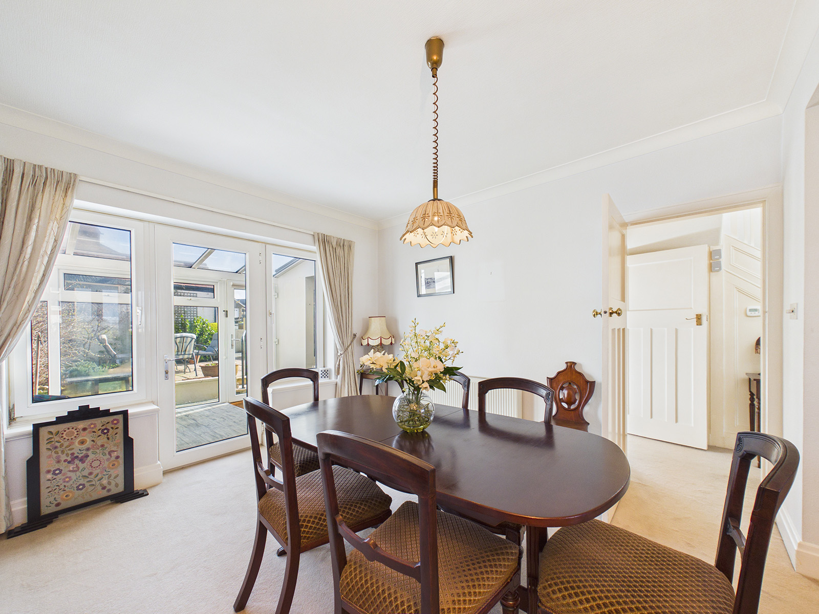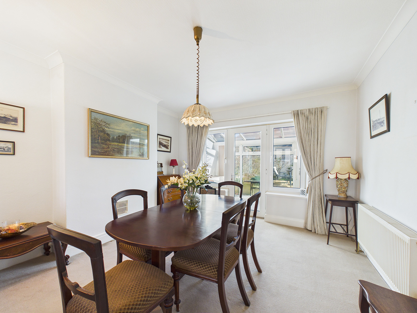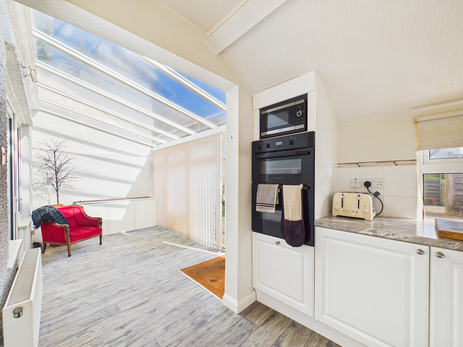 The room enjoys dual-aspect windows, allowing plenty of natural light to fill the space throughout the day. There is excellent storage provided by the generous selection of cupboards, and the room is completed with a wood‑effect flooring. An opening leads directly into the conservatory, creating a natural flow between the living spaces.