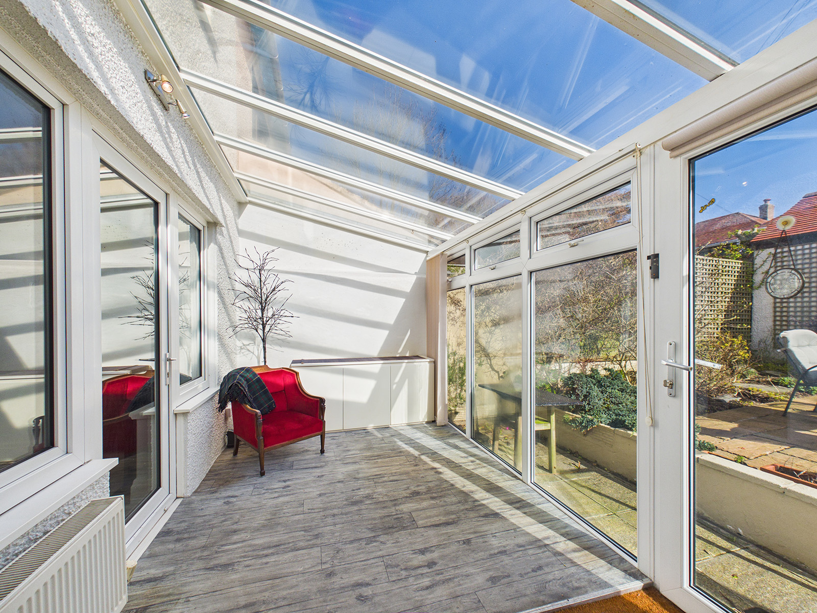 The conservatory features wood‑effect flooring and enjoys pleasant views over the rear garden, with direct access outside.
